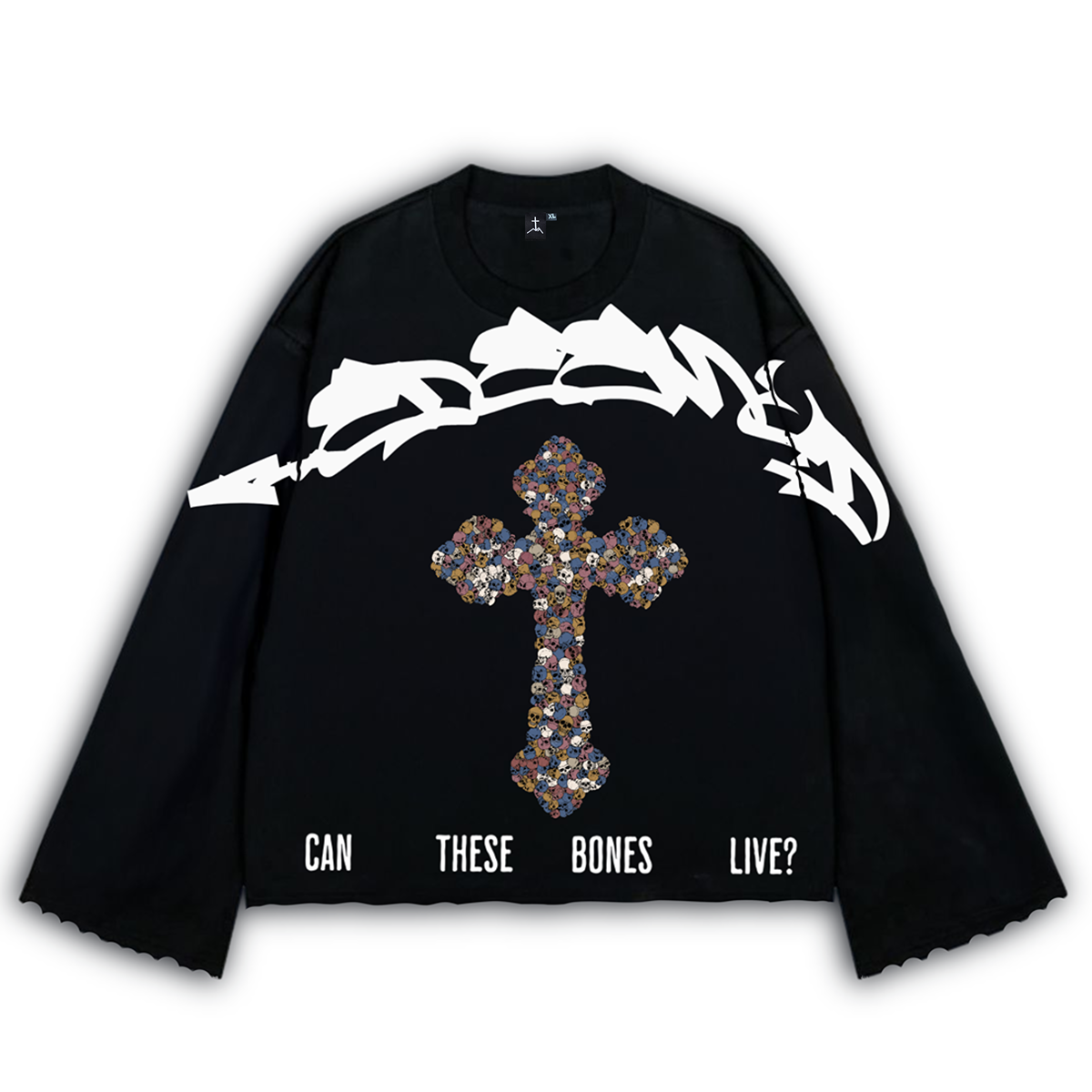 'VALLEY OF DRY BONES' CROPPED/OVERSIZED LONG TEE- BLACK
