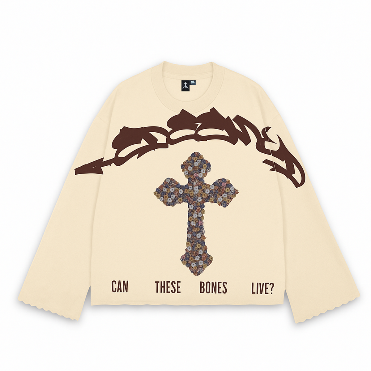 'VALLEY OF DRY BONES' CROPPED/OVERSIZED LONG TEE- CREAM